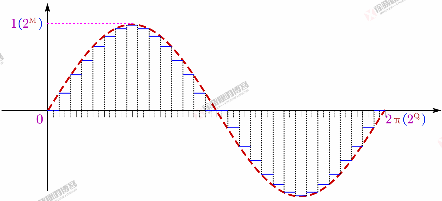 红色部分为标准正弦曲线,蓝色部分是查找表所表示的正弦曲线,它只能取有限个值,相位被均分为2^Q^等分,根据截断后的相位得到横坐标值,由此得到的纵坐标值就是输出正弦值了。