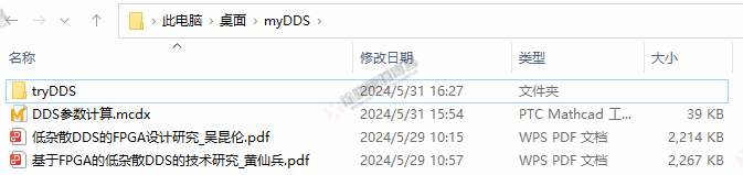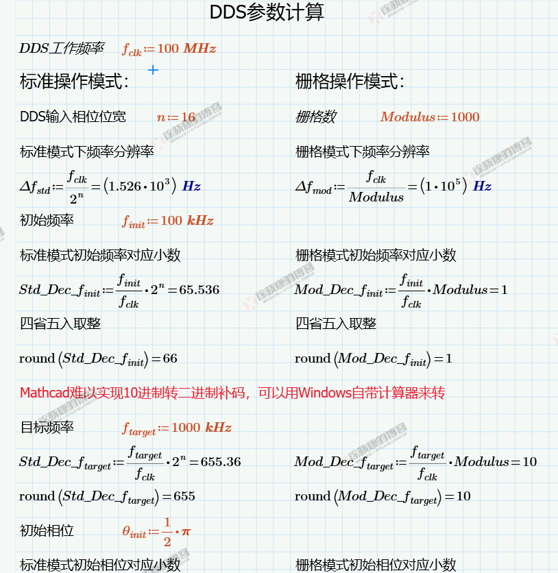 为方便的计算DDS的各种参数,特别是设置初始频率与PINC,本人编写了基于Mathcad编写了DDS参数计算书,只需改变橙黄色标记的参数,就能实现自动计算,部分截图如下: