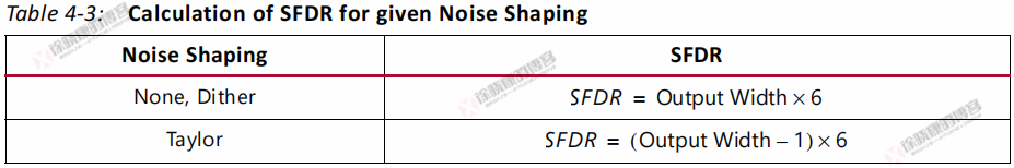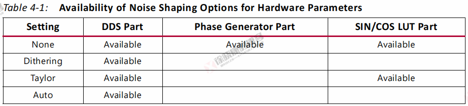 下表总结了硬件参数下噪声整形选项的可选范围。注意噪声整形选项的选择将限制硬件参数的输入输出位宽范围。