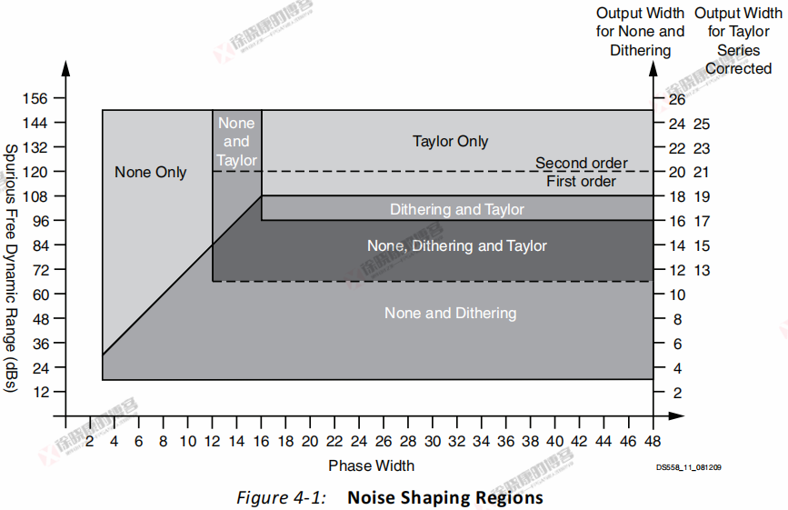 图4-1展示了每个噪声整形选项操作的SFDR和相位宽度区域。对于“None”、“相位抖动”和“泰勒级数校正”这三种噪声整形方法,存在三个重叠的区域,并且使用了更深的阴影层次来指示区域重叠的部分。最暗的区域是这三个区域完全重叠的地方,表明所有三种噪声整形方法都可行。下方的虚线表示泰勒级数校正仅在SFDR大于66.0分贝(而非等于66.0分贝)时有效。相位宽度可以增加,以便针对特定的SFDR目标最大化可用的噪声整形选项数量。